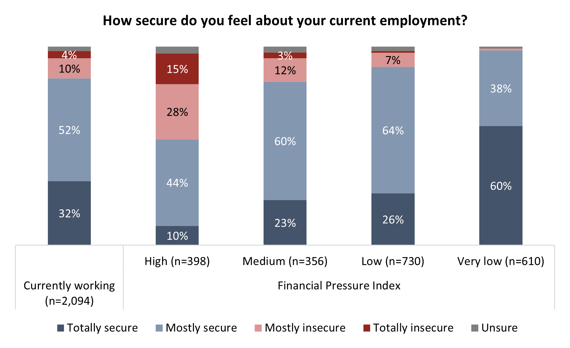 One of the key items on this index is how secure a person’s job feels. Among those with high pressure, only 10 per cent feel totally secure, while more than two-in-five feel insecure. For those with very low pressure, this simply isn’t a factor in their life.