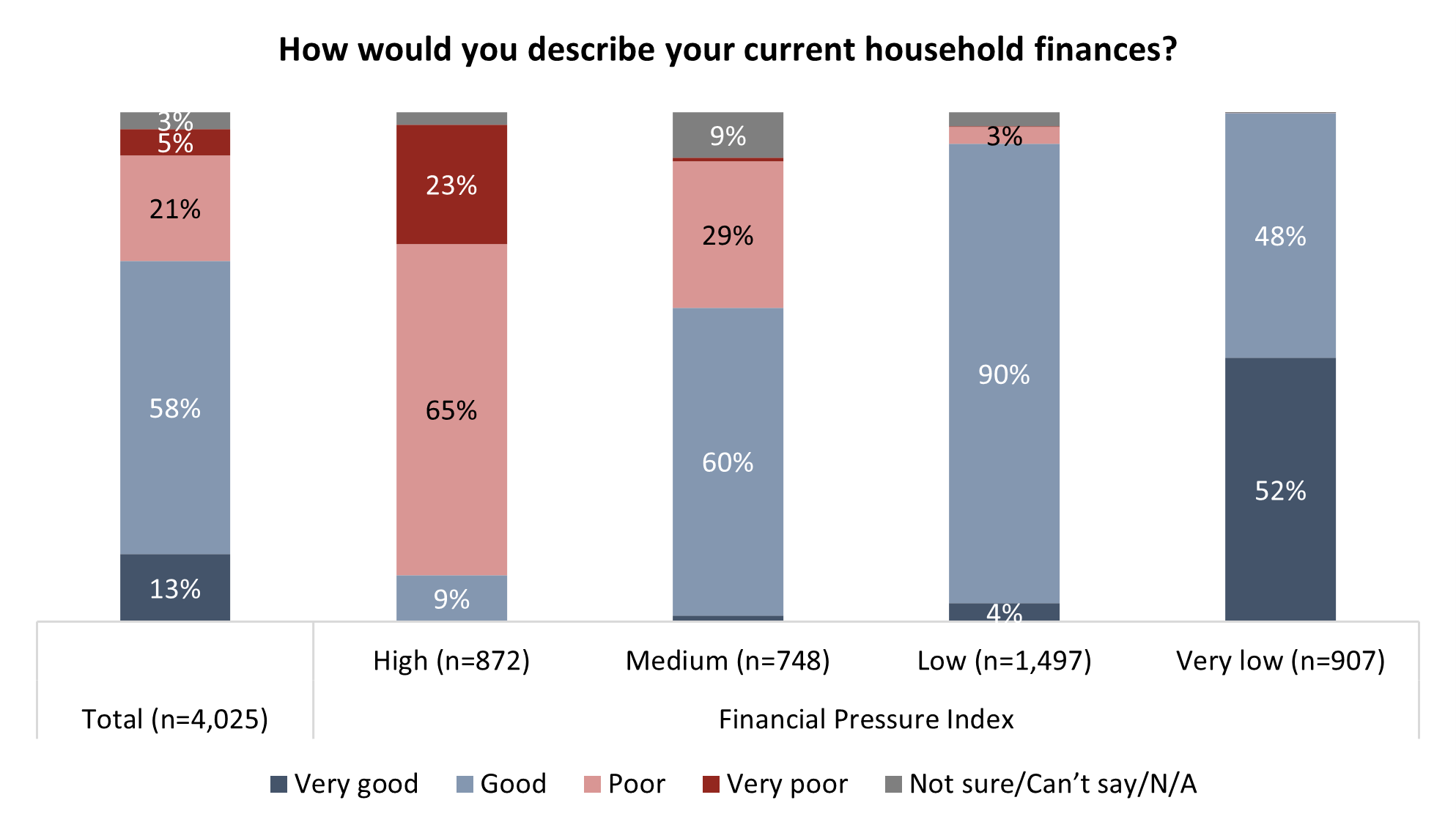 The same can be said of one’s own household finances. Each group has a different level of security that they self-profess, with that group of one-in-five high pressure individuals near unanimous in the belief that their finances are poor or very poor: