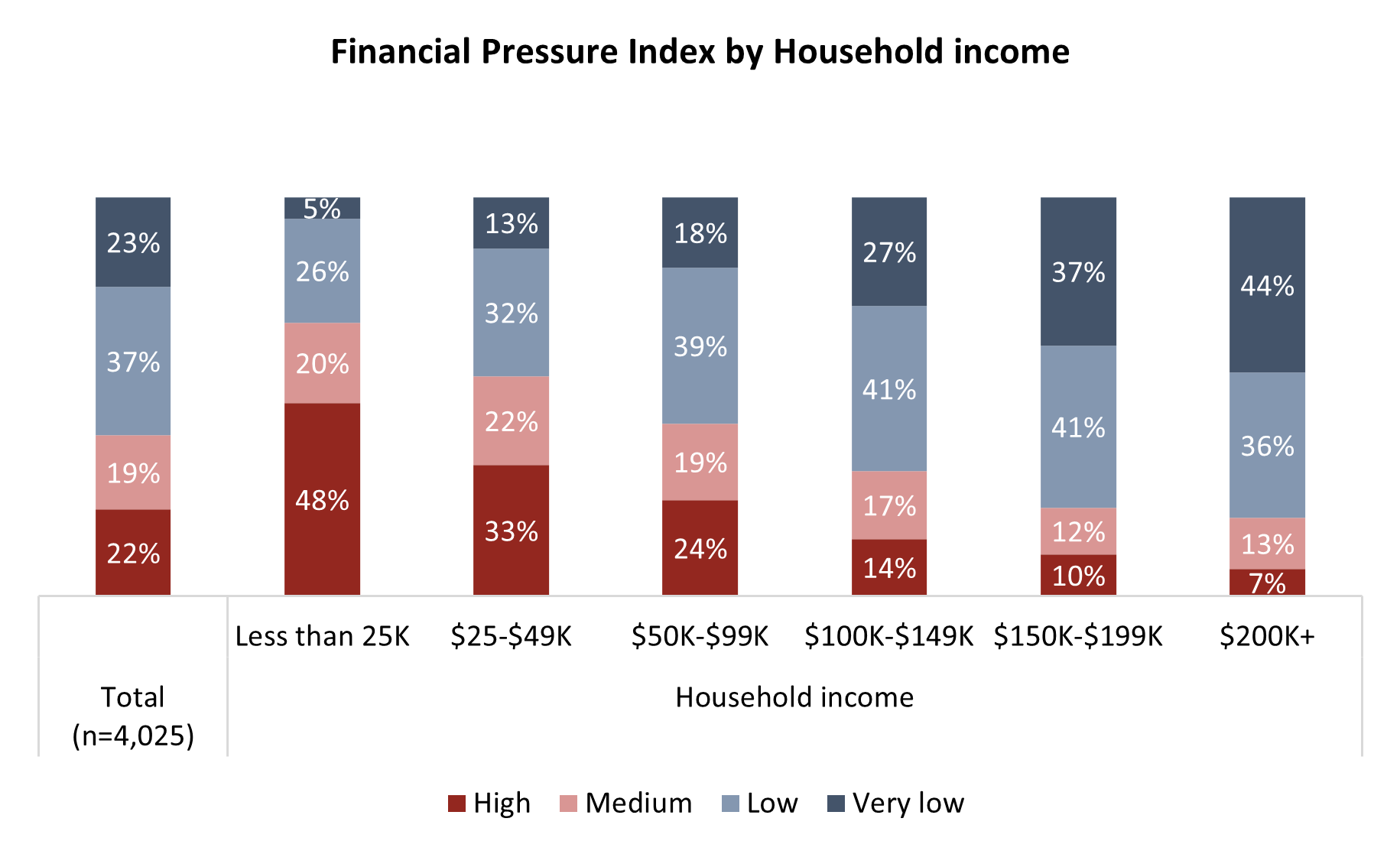 There is no group for which financial pressure is inescapable, but there are clear correlating factors. The starkest of which is household income level. For other demographics that play a role, including age, viewed detailed tables here.