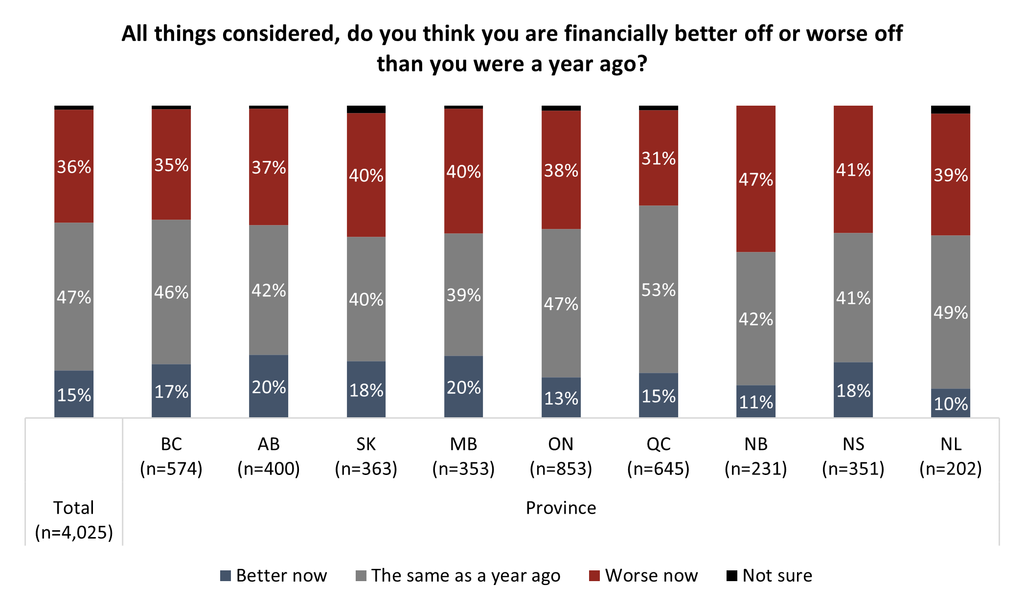 This ratio of better-same-worse holds relatively similarly across the country, though it is worth noting that the proportion of those saying they are worse off now is highest in New Brunswick at 47 per cent and lowest in Quebec at 31 per cent: