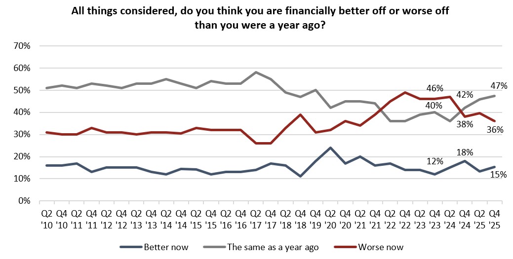 Angus Reid Institute has been tracking the economic perceptions of Canadians for more than a decade now. 2025 saw fewer Canadians saying they are worse off now than they were a year ago compared to 2024, but still a considerable portion (36%) holding this view. The largest group (47%) say they are in about the same place financially now as they were heading into last Christmas, while the smallest group (15%) are better off: