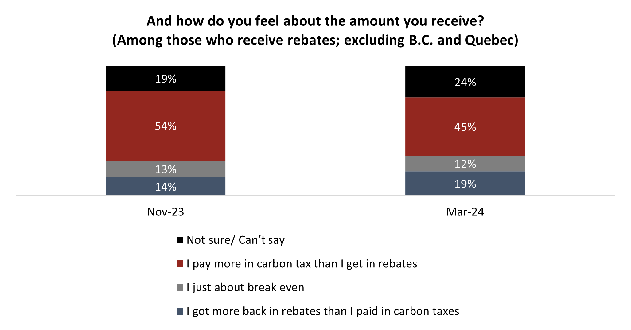 At issue for the federal government is awareness of rebates. In November, only two-in-five of those living in provinces subject to the federal carbon tax said they were certain their household had received a rebate.